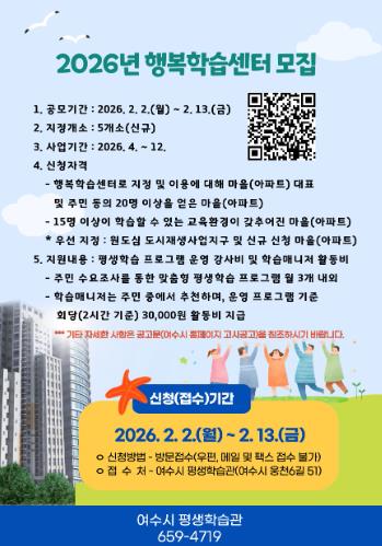 [파이낸셜경제=김예빈 기자] 여수시는 주민 생활권 중심의 평생학습 기회를 확대하기 위해 '2026년 읍·면·동 행복학습센터' 신규 지정 사업에 참여할 마을(아파트)을 모집한다고 밝혔다.