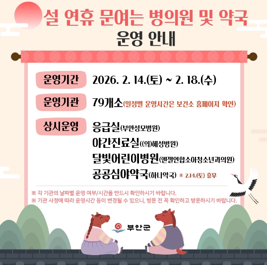 특히 지역응급의료기관인 부안성모병원은 24시간 응급실을 운영할 계획이며, 혜성병원은 야간진료실(09:00~17:00)을, 엔젤연합소아청소년과의원은 달빛어린이병원(10:00~18:00)으로 운영하며, 부안군보건소는 2. 17. 설날 당일에 진료를 실시할 예정이다