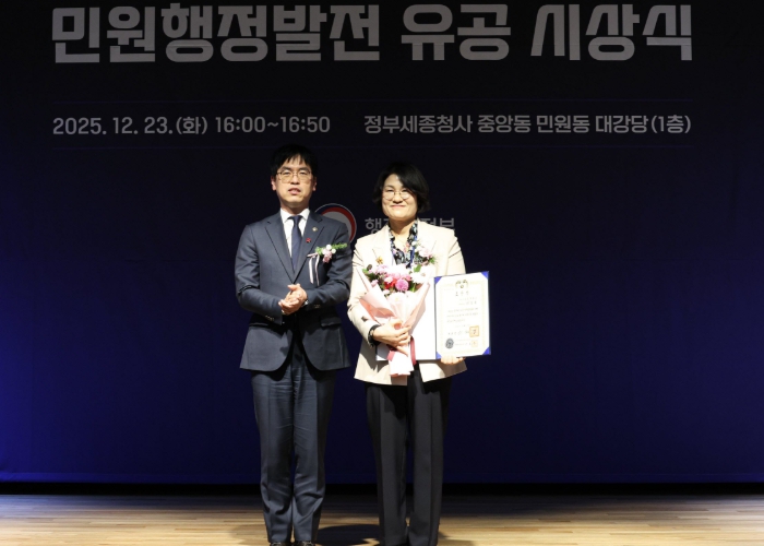 [파이낸셜경제=김예빈 기자] 진주시 민원여권과 이은주 민원팀장이 23일, 정부세종청사에서 열린 ‘2025년 민원행정발전 유공 시상식’에서 민원행정 발전에 기여한 공로를 인정받아 ‘민원담당자 보호분야’의 대통령 표창을 수상했다.