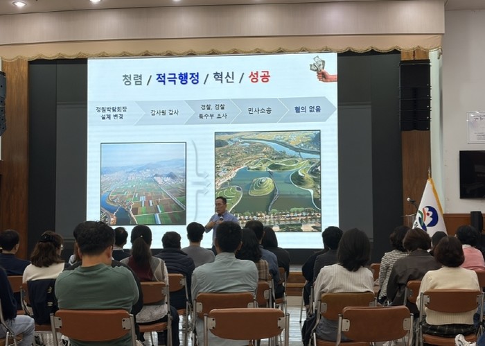 최덕림 강사는 30여 년의 공직 경험을 바탕으로 자신이 추진했던 정책과 현장의 혁신 사례를 소개하며, 행정이 변하면 도시가 바뀐다는 메시지를 전했다.