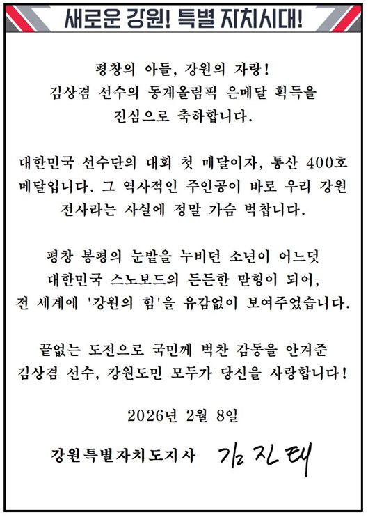 축전을 받은 김상겸 선수는 “강원도의 지속적인 지원 덕분에 이 자리에 설 수 있었고, 한마음으로 응원해주신 강원도민 여러분께도 진심으로 감사드린다”라고 화답했다.