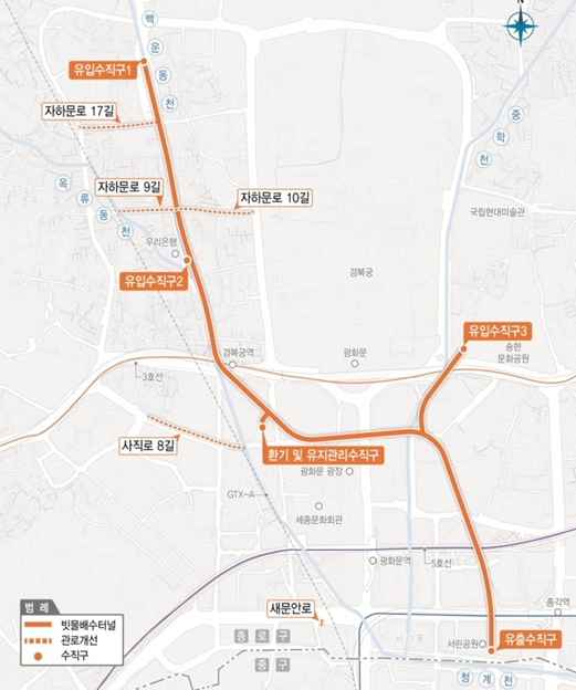 집중호우 시 기존 하수관거의 통수능력을 초과하는 우수 발생을 대비하여, 우수를 수직구를 통해 터널로 우회·저류하고, 서린공원 내 설치 예정인 유출수직구를 통해 청계천으로 방류하는 구조다. 시설 설치가 완료되면 광화문광장 침수 방지 효과가 높아질 것으로 예상되며, 이후 단계적으로 진행되는 우수관거 정비가 마무리되면 광화문 일대 전역의 침수 예방 능력이 강화될 전망이다.