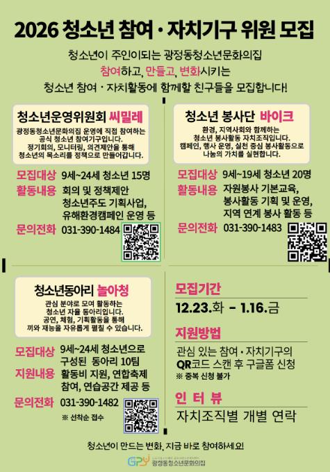청소년 자치기구 모집은 선착순으로 진행되며, 자세한 사항은 광정동청소년문화의집으로 문의하거나 포스터 내 QR코드를 통해 확인할 수 있다.
