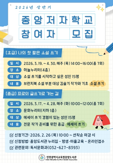 [파이낸셜경제=김기보 기자] 인천광역시교육청중앙도서관은 26일부터 시민의 글쓰기 역량 강화를 위한 상반기 ‘중앙저자학교’ 프로그램 참여자를 모집한다.