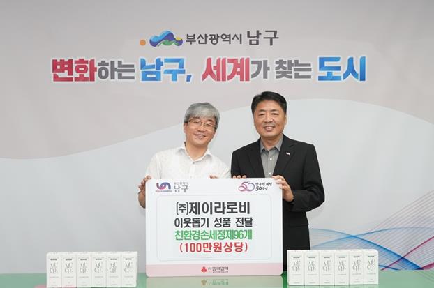 [파이낸셜경제=박영진 기자] ㈜제이라로비는 지난 15일 부산 남구에 100만 원 상당의 후원 물품(손세정제)을 전달했다.