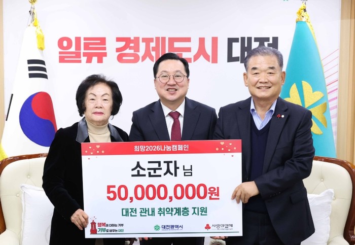 [파이낸셜경제=김영란 기자] 대전시는 15일 오전 시청 10층 응접실에서 아너소사이어티 회원인 소군자 기부자(124호)로부터 대전사회복지공동모금회를 통해 관내 취약계층 지원을 위한 성금 5천만 원을 전달받았다.