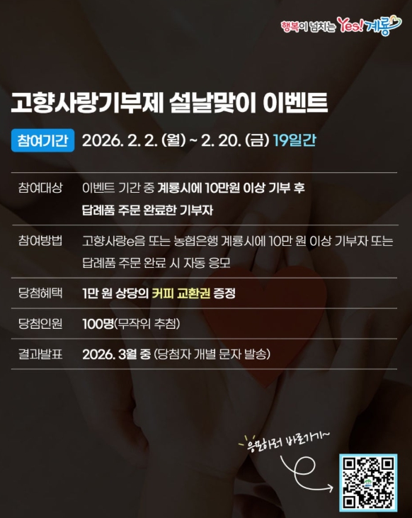 시 관계자는 “설 명절을 맞아 고향을 응원하는 마음을 기부로 표현할 수 있도록 이번 이벤트를 마련했다”며 “더 많은 분들이 고향사랑기부제에 참여해 계룡시 발전에 힘을 보태주길 기대한다”고 말했다.