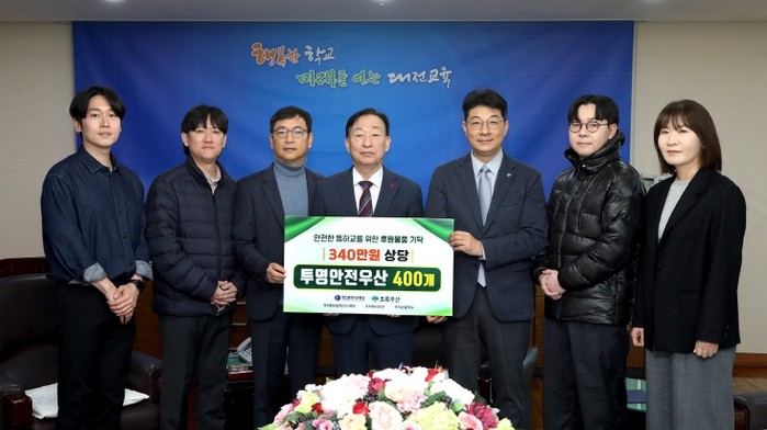 [파이낸셜경제=김영란 기자] 대전시교육청은 12월 8일 초록우산 대전지역본부로부터 340만원 상당의 투명안전우산 400개를 전달받았다고 밝혔다.
