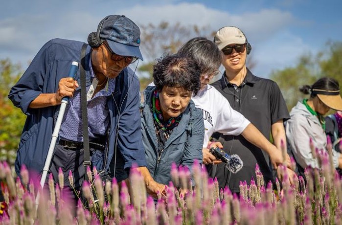 | ▲ 지난 17일 「사운드순천」에 참가한 시각장애인들이 순천만국가정원에서 꽃을 느껴보고 체험하고 있다.j |