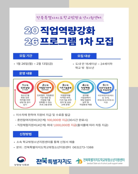 [파이낸셜경제=김예빈 기자] 전북특별자치도 학교 밖 청소년 지원센터(센터장 이상염)는 1월 26일부터 2월 13일까지 도내 만 15세 이상 24세 이하 학교 밖 청소년을 대상으로 ‘2026년 직업역량강화 프로그램’ 1차 참여자를 모집한다.