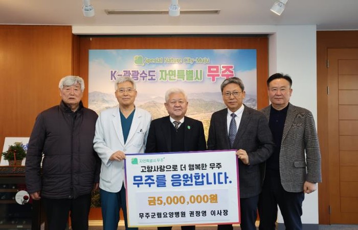 [파이낸셜경제=김예빈 기자] 무주군으로부터 무주군립요양병원을 위탁받아 운영하는 (사)소산 권창영 이사장이 고향사랑기부금 5백만 원을 기탁했다. 이날 기탁식에는 권도훈 무주군립요양병원장과 임원진 등 4명이 함께 해 의미를 더했다.