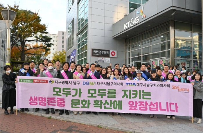 [파이낸셜경제=김지훈 기자] 대구 남구는 11월 11일 남구 주요 네거리를 중심으로 지역사회 자살예방 및 생명존중 문화를 확산하기 위해 14개 보건의약단체 및 주민단체가 합동으로 대대적인 캠페인을 펼쳤다고 밝혔다.