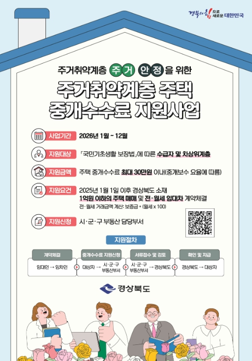 구비서류는 ▲주택 중개보수 지원 신청서 ▲국민기초생활수급자 증명서 또는 차상위계층 확인서 ▲주민등록등본(최근 5년 주소변동사항 포함) ▲매매(임대차)계약서 사본 ▲중개보수 지급 영수증 사본 ▲통장 사본(압류방지통장 제외) ▲개인정보의 수집·이용 및 제3자 제공 동의서로, 자세한 내용은 경상북도 홈페이지(분야별 정보-산업/토지/주택-부동산-부동산 중개보수 지원사업 탭)에서 확인할 수 있다.
