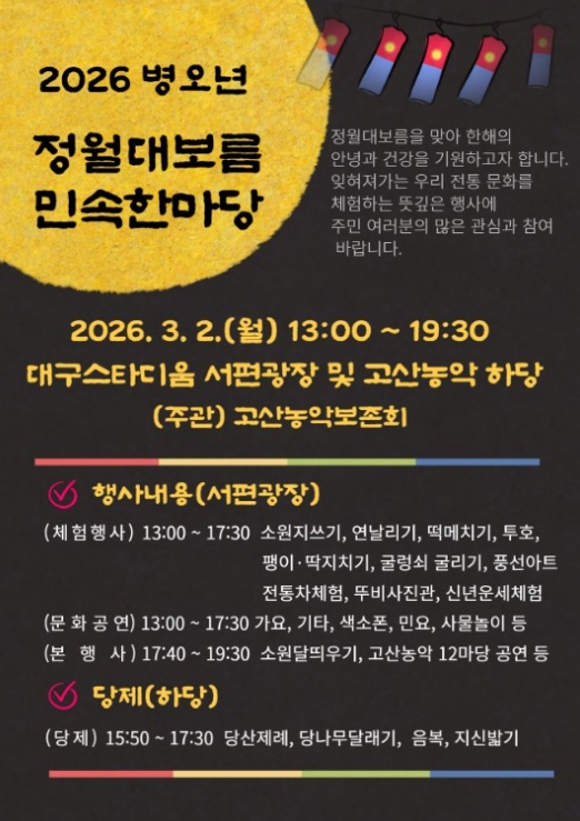 이번 행사는 대구의 대표적인 무형유산인 고산농악을 중심으로, 시민들이 전통문화의 정수를 직접 체험하며 한해의 액운을 물리치고 복을 기원하는 소통의 장으로 마련된다.