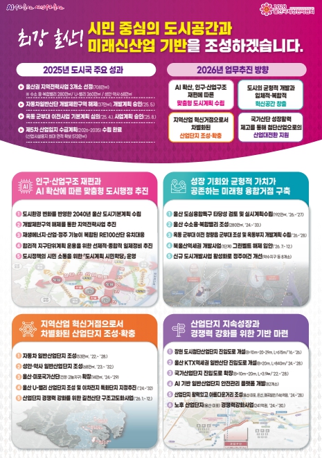 [파이낸셜경제=김예빈 기자] 울산시가 ‘최강 울산!’ 완성을 위한 시민 중심의 도시공간 조성과 미래 신산업 기반 구축을 목표로 2026년 도시 분야 정책을 추진한다.