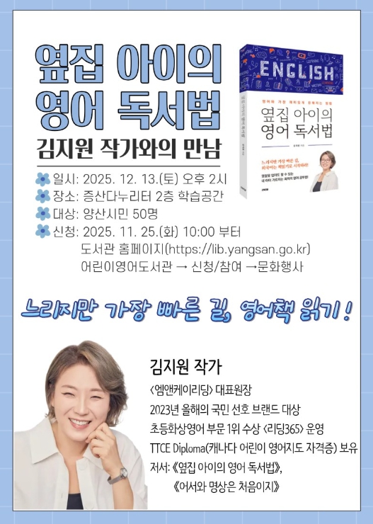 [파이낸셜경제=김예빈 기자] 양산시립 어린이영어도서관은 오는 12월 13일 오후 2시 『옆집 아이의 영어 독서법』의 저자 김지원 작가를 초청하여 작가와의 만남을 운영한다.