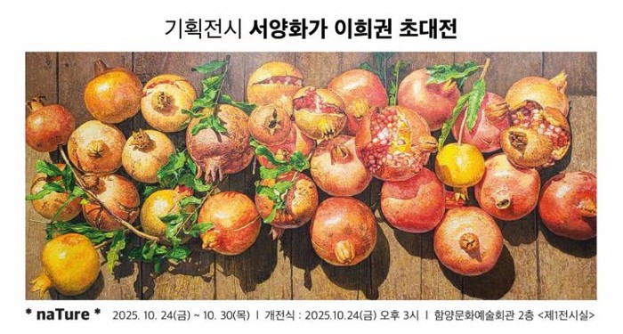 [파이낸셜경제=김예빈 기자] 함양군은 오는 10월 24일부터 30일까지 함양문화예술회관 제1전시실에서 2025년 기획 전시로 서양화가 이희권 작가를 초대해 ‘naTure(네이처)’를 개최한다.