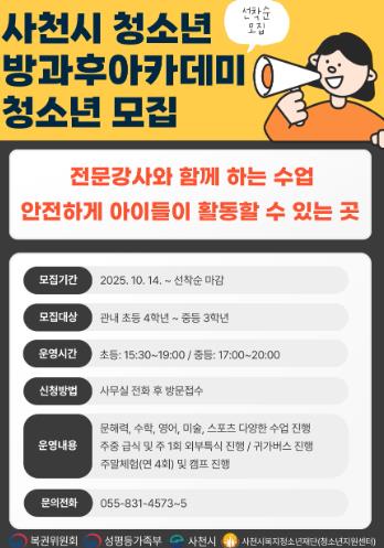 | ▲ 사천시 청소년방과후아카데미 신규 청소년 모집 |