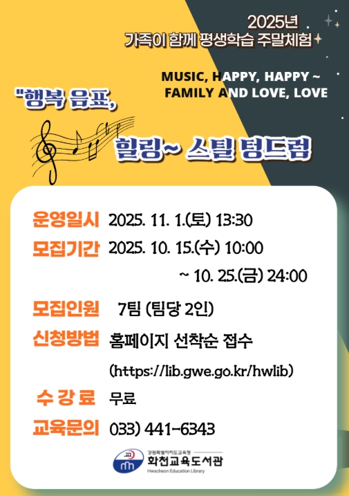 [파이낸셜경제=조성환 기자] 강원도교육청 화천교육도서관은 군민을 대상으로 2025년 11월 평생학습 주말체험 ‘늦가을, 가족 음악 특강: 행복 음표, 힐링 스틸 텅드럼’을 운영한다.