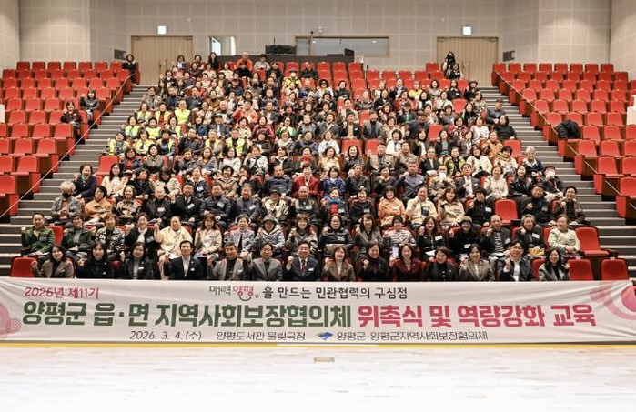 [파이낸셜경제=김영란 기자] 양평군은 지난 4일 양평도서관 물빛극장에서 250여 명이 참석한 가운데 ‘2026년 제11기 읍면 지역사회보장협의체 위촉식 및 역량 강화 교육’을 개최하고, 지역 맞춤형 복지안전망 강화를 위한 본격적인 활동에 들어갔다고 밝혔다.