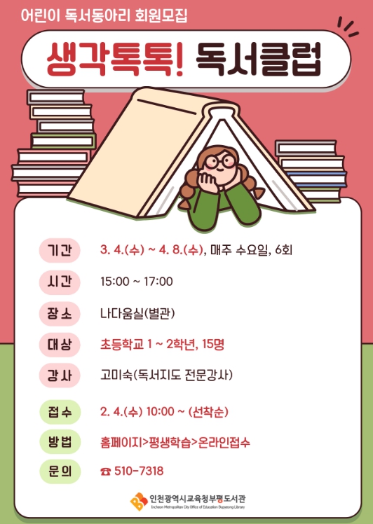 [파이낸셜경제=김기보 기자] 인천광역시교육청부평도서관은 3월 4일부터 4월 8일까지 2026년 상반기 어린이 독서동아리 ‘생각 톡톡! 독서클럽’을 운영한다.