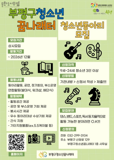 [파이낸셜경제=김기보 기자] 부평구청소년꿈나래터는 ‘2026년도 청소년자율동아리’를 상시 모집한다고 23일 밝혔다.