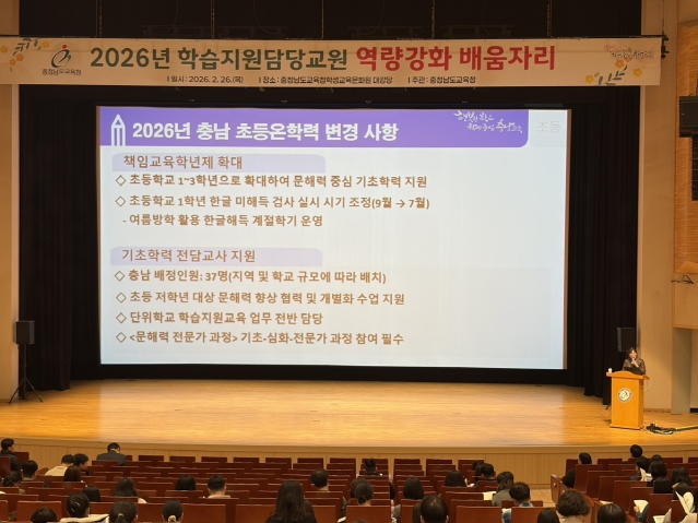 [파이낸셜경제=김영란 기자] 충남교육청은 26일 충남교육청학생교육문화원(천안)에서 2026년 학습 지원 담당 교원 410명과 14개 시군 교육지원청 기초학력 담당 장학사를 대상으로 배움자리를 개최했다.