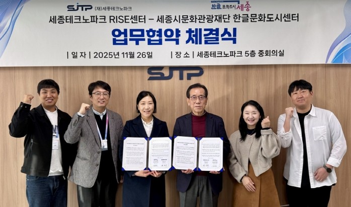 [파이낸셜경제=김영란 기자] 세종시문화관광재단 한글문화도시센터(센터장 양유정)와 세종테크노파크 RISE센터(센터장 윤석무)가 ‘한글문화도시 세종’ 조성과 지역혁신 역량 강화를 위한 협력에 나섰다.