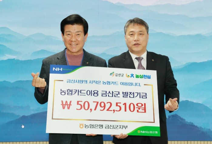 이 기금은 금산군과 엔에이치(NH)농협은행 간 약정에 따라 주민 및 법인이 사용하는 금산사랑카드 및 공무를 위해 사용한 보조금 카드에 대한 이용 실적의 일정 비율을 적립해 마련됐다.