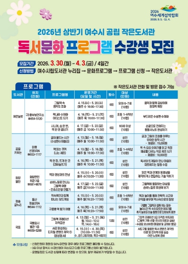 [파이낸셜경제=김예빈 기자] 여수시는 오는 3월 30일부터 4월 3일까지 공립 작은도서관 ‘2026년 상반기 독서문화 프로그램’ 수강생을 모집한다고 밝혔다.
