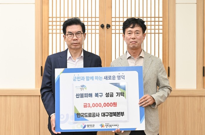 [파이낸셜경제=김지훈 기자] 한국도로공사 대구경북본부는 지난 24일 김광열 영덕군수를 만나 산불로 큰 피해를 본 주민들을 돕기 위해 성금 300만 원을 기탁했다.