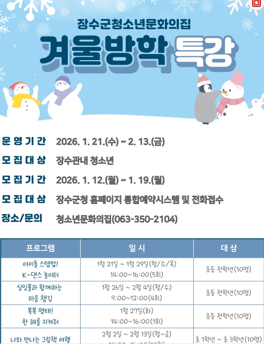 겨울방학 특강 프로그램 접수는 오는 12일부터 19일까지 장수군 누리집 통합예약시스템을 통해 선착순으로 진행된다. 자세한 내용은 누리집 통합예약시스템을 참고하거나 장수군 청소년문화의집으로 문의하면 된다.