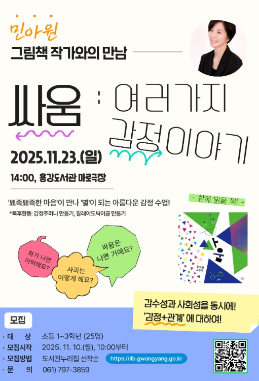 [파이낸셜경제=김예빈 기자] 광양용강도서관은 오는 11월 23일 오후 2시, 마로극장에서 초등학교 1~3학년 어린이를 대상으로 그림책 『싸움』의 저자 민아원 작가와의 만남을 운영한다고 밝혔다.