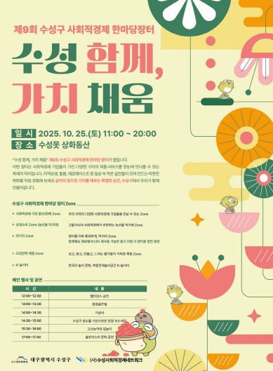 [파이낸셜경제=김지훈 기자] 대구 수성구는 오는 25일 오전 11시부터 오후 8시까지 수성못 상화동산 일대에서 사회적경제기업의 지속적인 성장과 자립 기반을 지원하고, 사회적 가치 실현을 주민과 함께 공유하기 위한 ‘2025 제9회 수성구 사회적경제 한마당 장터’를 개최한다고 밝혔다.