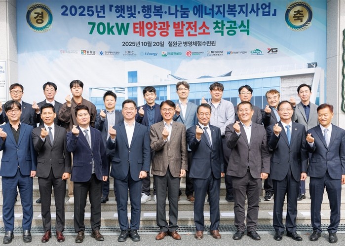 | ▲ 10월 20일 강원특별자치도 철원군에 위치한 ‘철원군병영체험수련원’에서 실시된 ‘햇빛·행복·행복 나눔 70kW 태양광 발전소 착공식’에서 관계자들이 단체 기념 촬영을 하고 있다. |