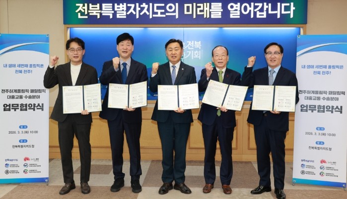 [파이낸셜경제=김예빈 기자] 전북특별자치도는 3일 도청 회의실에서 전주하계올림픽·패럴림픽 유치를 위한 대중교통·수송 분야 업무협약을 체결하고, 안전하고 체계적인 수송 지원 기반 마련에 본격 나섰다.