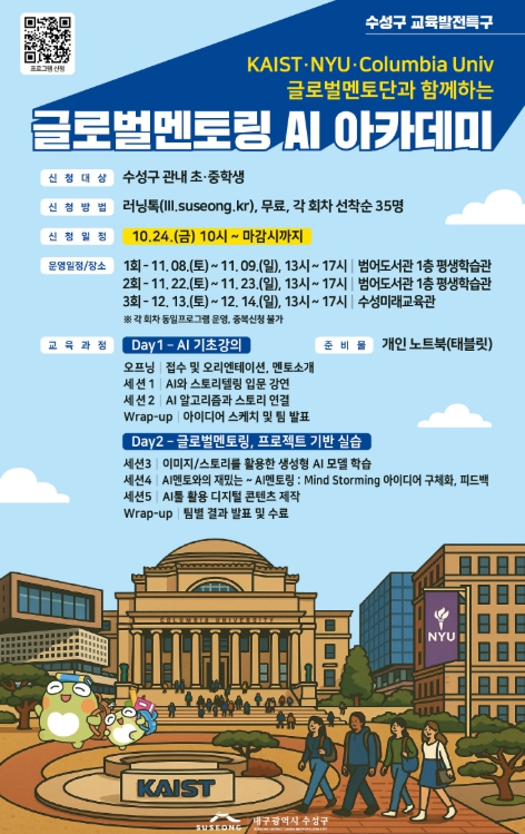 [파이낸셜경제=김영란 기자] 대구 수성구는 오는 11월 7일 범어도서관 김만용·박수년홀에서 ‘글로벌 교육 전문가와 함께하는 수성 AI 인재 미래교육 포럼’을 개최하고, 연계 프로그램인 AI 아카데미를 통해 미래세대를 위한 교육혁신과 글로벌 협력의 출발점을 연다.