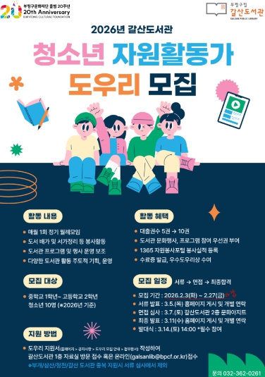 [파이낸셜경제=김기보 기자] 부평구립 갈산도서관은 오는 27일까지 청소년 자원활동가 ‘도우리’를 모집한다고 밝혔다.
