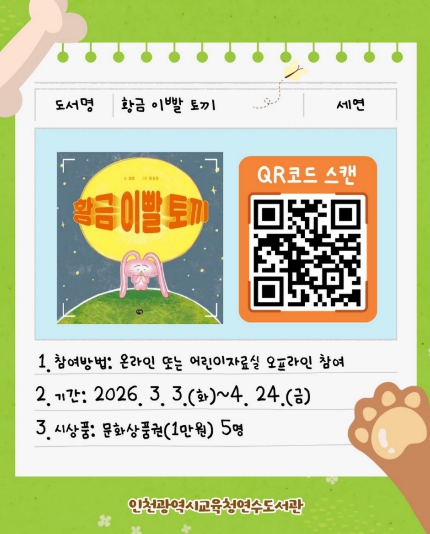이번 선정 도서는 세연 작가의 동화 ‘황금 이빨 토끼’로, 주인공이 황금 이빨을 얻기 위해 벌이는 모험을 통해 양치질의 중요성과 올바른 습관을 재미있게 전달하고, 책 속 주요 에피소드를 활용한 퀴즈를 진행하여 어린이의 흥미와 참여를 높일 예정이다.