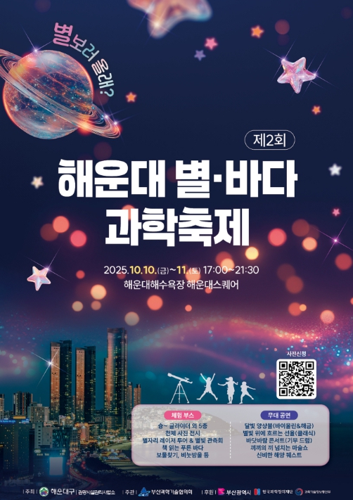 [파이낸셜경제=박영진 기자] 해운대구는 부산과학기술협의회와 함께 10월 10일과 11일 오후 5시부터 9시 30분까지 해운대해수욕장 해운대스퀘어에서 ‘제2회 해운대 별, 바다 과학축제’를 연다.