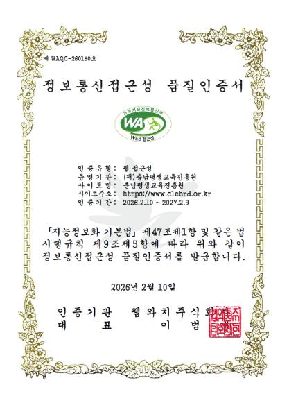 | ▲ 충남평생교육진흥원 누리집 정보통신접근성 품질인증서 |
