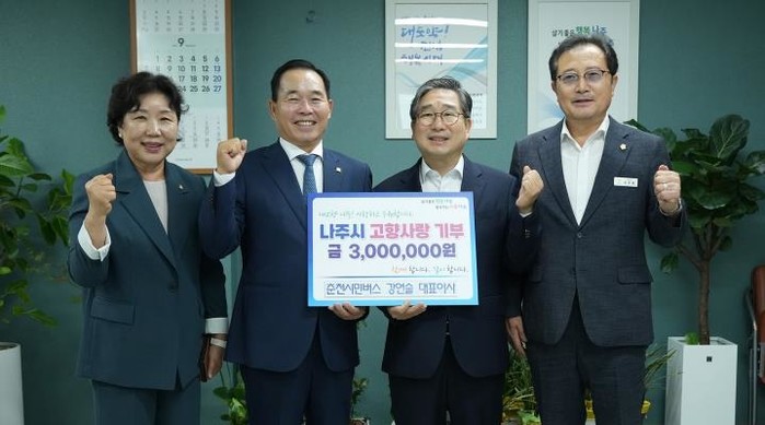 [파이낸셜경제=김예빈 기자] 전라남도 나주시는 춘천시민버스 강연술 대표(왼쪽 두번째)가 지난 25일 지역사회 발전을 위해 고향사랑기부금 300만 원을 기탁했다고 밝혔다.