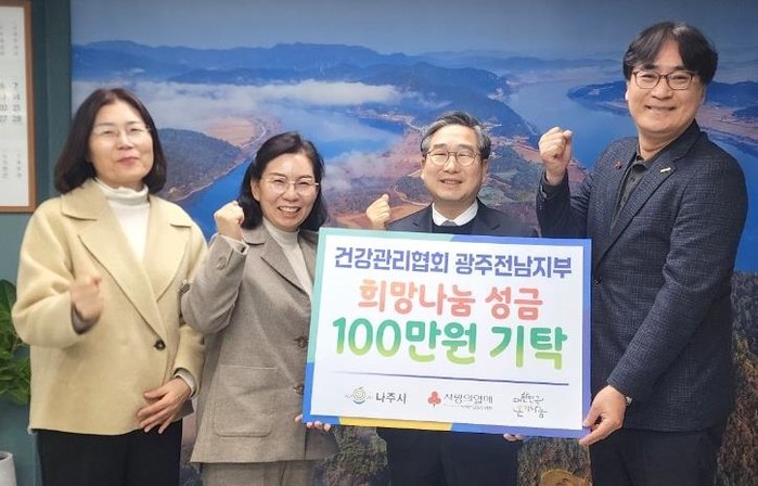 [파이낸셜경제=김예빈 기자] 전라남도 나주시는 건강관리협회 광주전남지부에서 지역 내 취약계층을 위한 사랑의 성금 100만 원을 기탁했다고 4일 밝혔다.