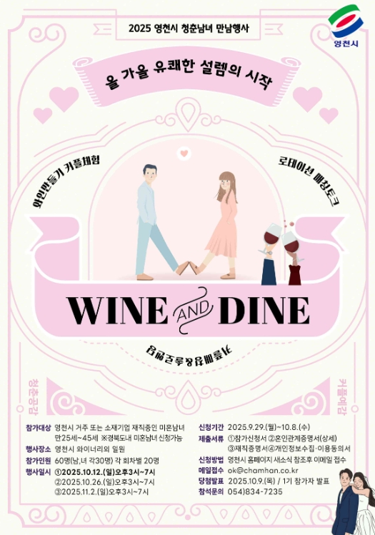 [파이낸셜경제=김지훈 기자] 영천시는 오는 10월 12일, 10월 26일, 11월 2일 세 차례에 걸쳐 관내 와이너리에서 미혼남녀를 위한 특별한 만남 프로그램 ‘2025 영천愛 와인·다인(wine·dine)’을 개최한다.