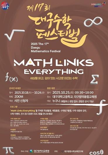 [파이낸셜경제=김지훈 기자] 대구시교육청이 주최하고 대구중등수학교육연구회가 운영하는 ‘제17회 대구수학페스티벌’이 10월 25일 9시 30분부터 대구과학고 및 대구창의융합교육원에서 'Math Links Everything(수학은 모든 것을 연결한다)'이라는 주제로 개최된다.