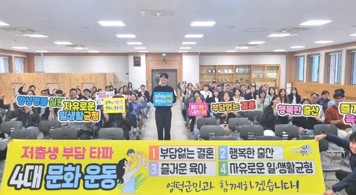 강의가 끝난 뒤 최 소장은 영덕군이 추진하는 ‘저출생 부담 타파 4대 문화 운동인 ’부담 없는 결혼, 행복한 출산, 즐거운 육아, 자유로운 일·생활 균형’ 홍보에도 함께했다.