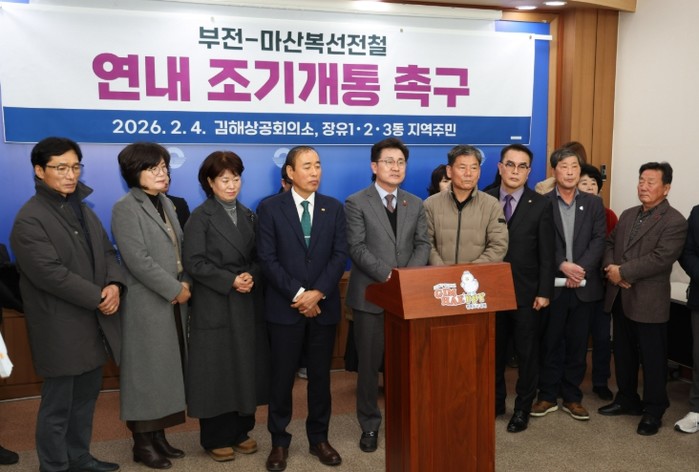 [파이낸셜경제=김예빈 기자] 김해시 상공계와 시민들은 4일 오전 11시 김해시청 브리핑룸에서 부전-마산복선전철의 연내 조기 개통을 강력 촉구했다.