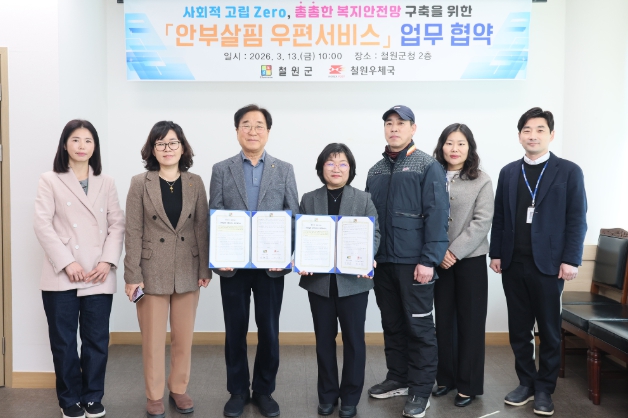 [파이낸셜경제=조성환 기자] 철원군은 2026년 3월13일 오전 10시, 철원군청 2층 군수 집무실에서 철원우체국(국장 최은애)과 ‘안부살핌 우편서비스’업무협약식을 체결했다.