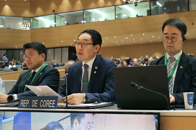 | ▲ 김완기 특허청장(왼쪽에서 2번째)이 스위스 제네바에서 열린 '제66차 세계지식재산기구(WIPO) 총회'에 참석해 대표연설을 하고 있다. |