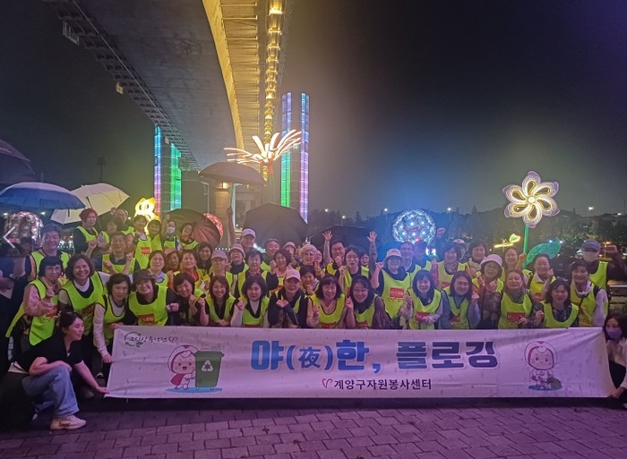 [파이낸셜경제=김예빈 기자] 인천 계양구자원봉사센터는 지난 24일 저녁, ‘계양아라온 아트웨이(빛의 거리 3단계)’와 ‘가을꽃 국화축제’가 열리는 현장에서 자원봉사자 74명과 함께 ‘야(夜)한 플로깅’ 봉사활동을 진행했다.